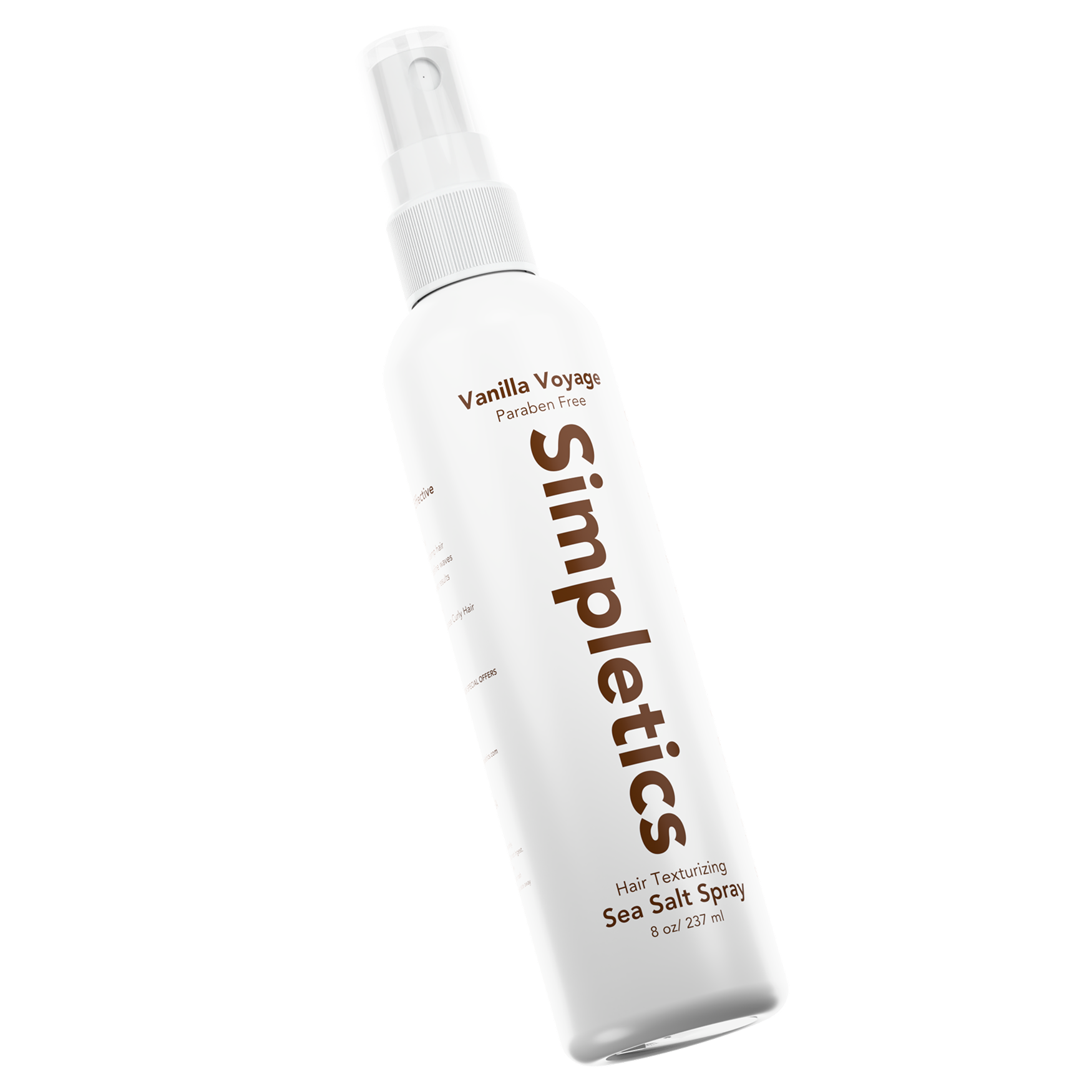 White bottle of Simpletics Sea Salt Spray with red text on black background.